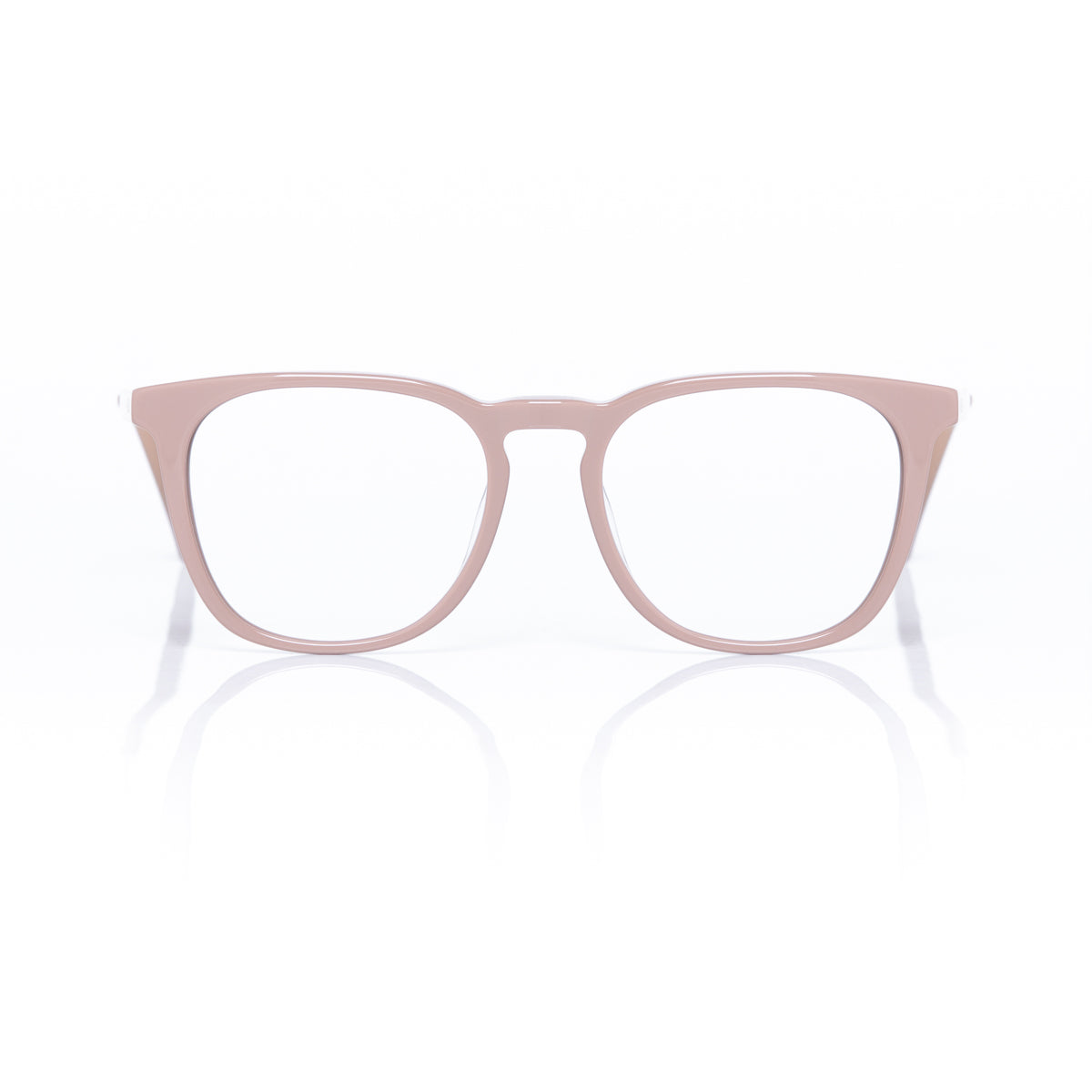 Eyeglass frame crafted from premium acetate, featuring a pink front with fixed metal hinge.