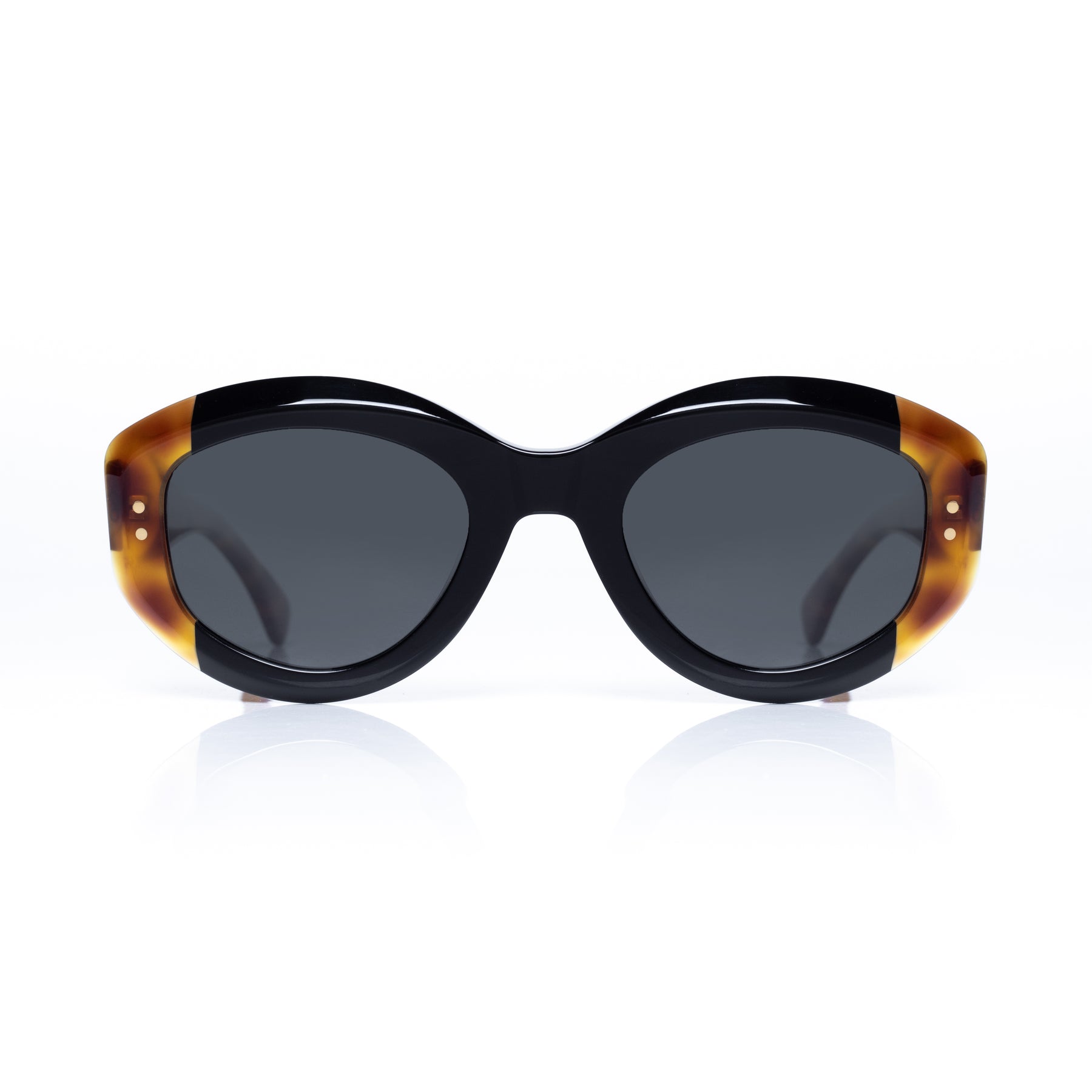 Sunglasses made of acetate with black front and tortoiseshell temples. Silver design details on the temples. Gradient sepia lenses with UV 400 protection and polarized.