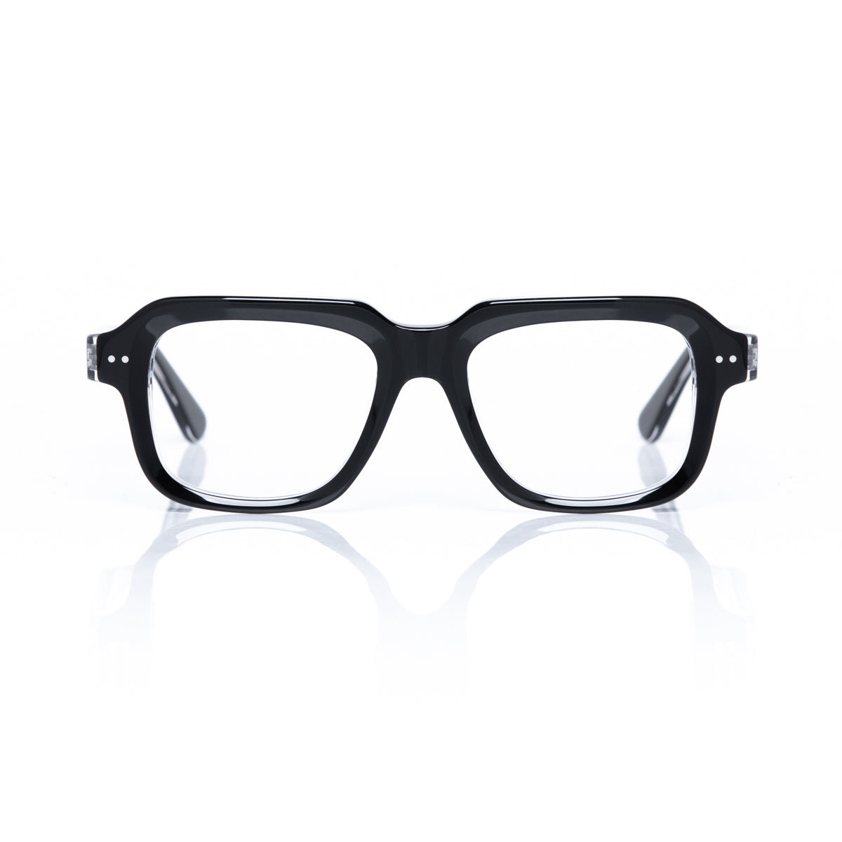 Bicolor acetate eyeglass frame with a black front and glossy translucent interior, featuring fixed black hinges and a translucent interior.