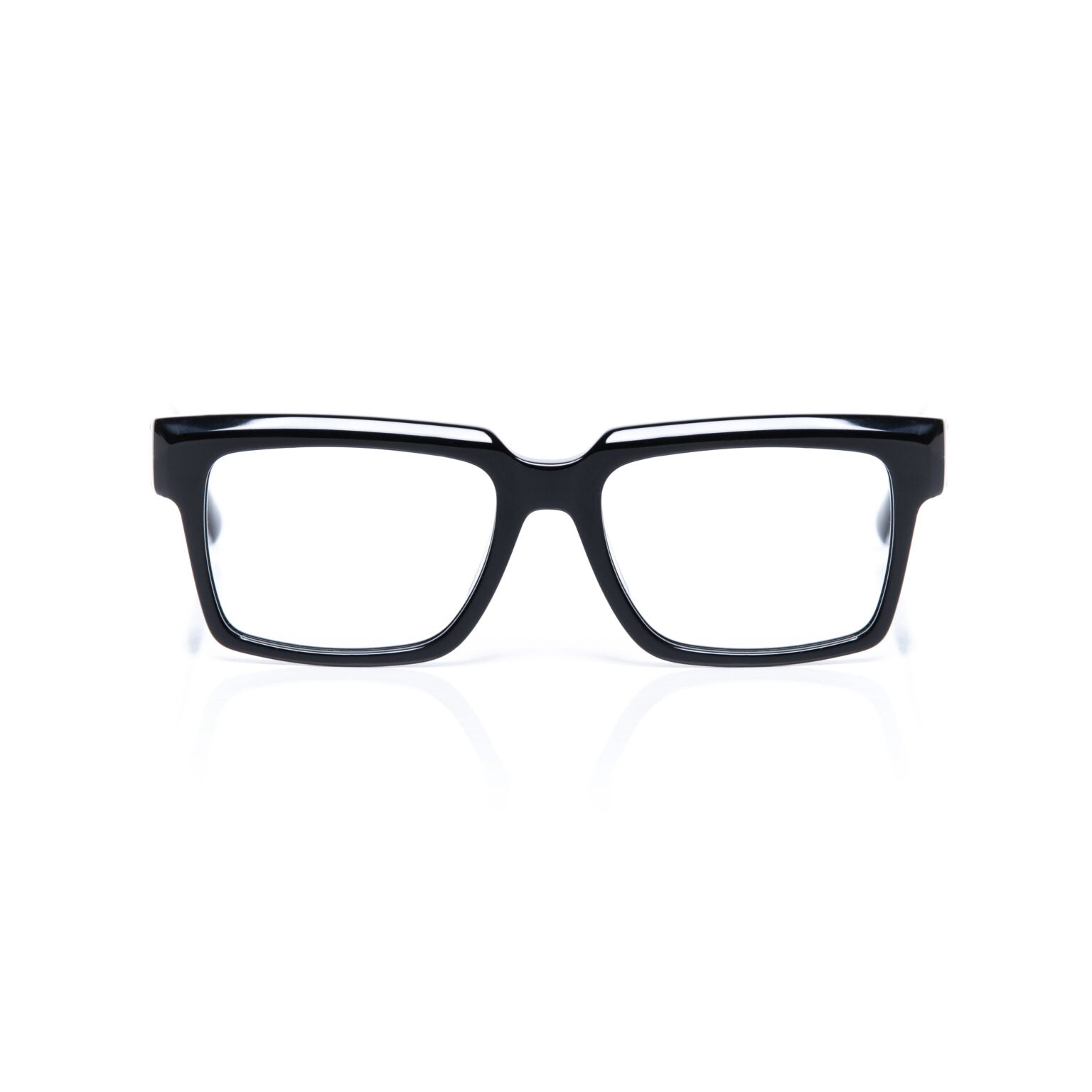 Eyeglass frame made of acetate with glossy black front and temples.