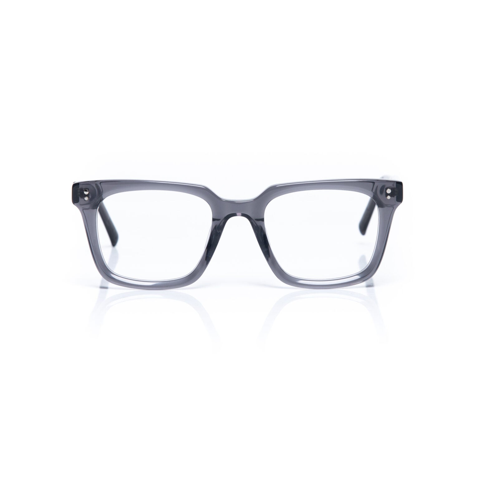 Eyeglass frame made of acetate with glossy translucent grey front and temples.