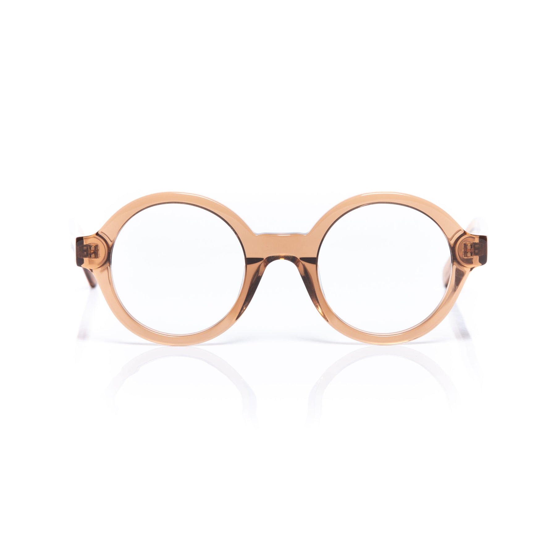 Eyeglass frame made of acetate with translucent glossy caramel front and temples.