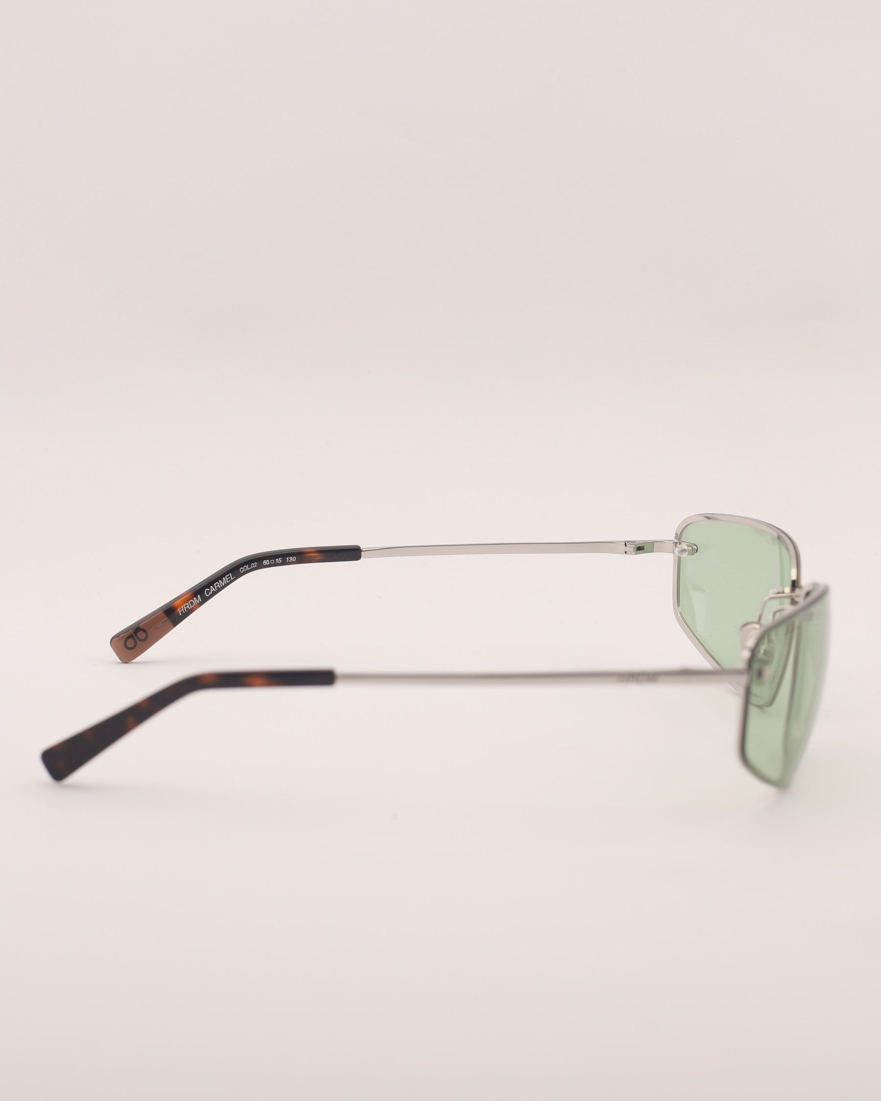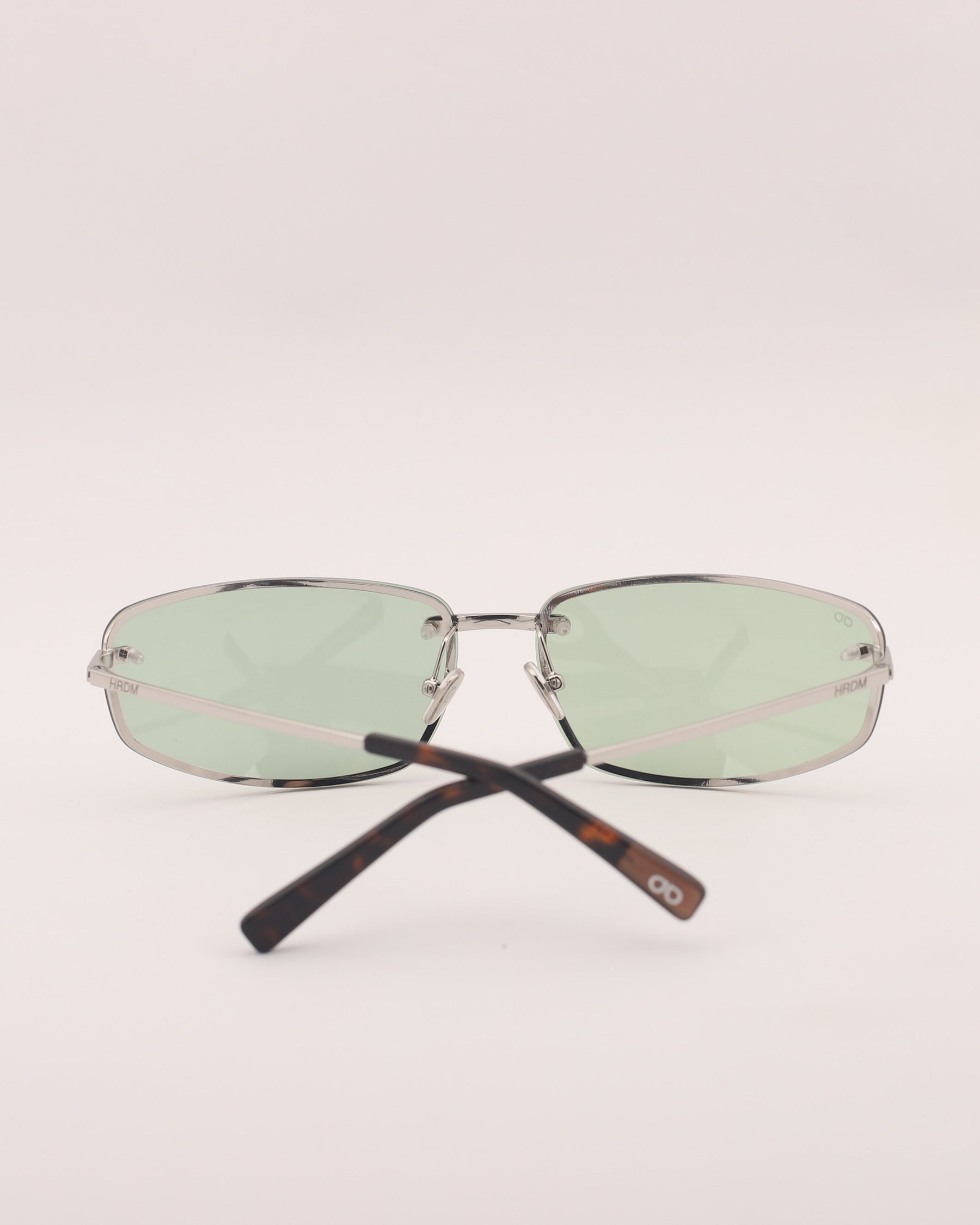 Sunglasses made of metal with a glossy silver front and temples. Compact light‑green lenses with UV 400 protection and polarization.