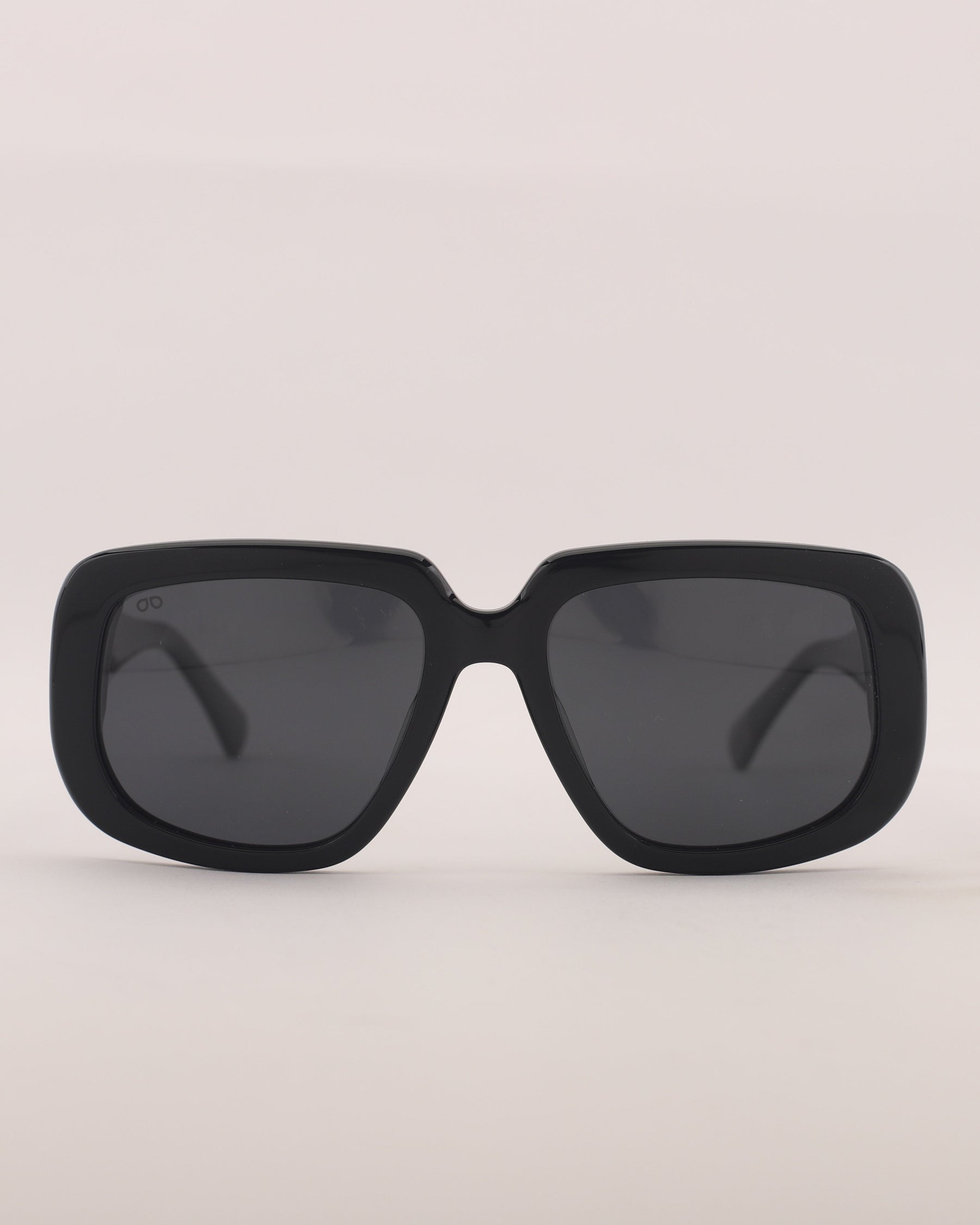 Sunglasses made of acetate with a glossy black front and temples. Compact grey lenses with UV 400 protection and polarization.